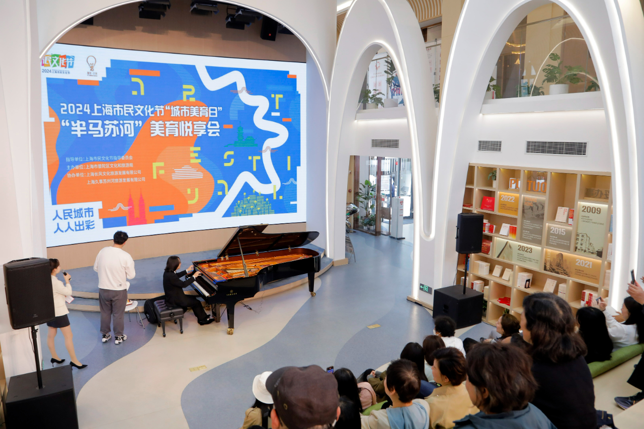 活动当天,普陀区16家公共文化场馆同步开展70余场丰富多彩的文化活动,启动市民文化节全年精彩。普陀区文化馆推出“艺起苏河SHOW”文化惠民系列文艺演出等活动,更有云上系列活动专题,让更多市民共享美育成果。区美术馆推出社会大美育品牌项目“臻美苏河.艺术大课堂”,并在馆内同步举办“时光印迹——刘海粟美术馆分馆馆藏精品展”。区图书馆举办了走读半马苏河美育研学活动,感受沪西工业遗存的焕发新生,探寻上海工人运动的历史记忆,领略工业文明的珍贵遗产。精彩纷呈的文化活动吸引众多市民前来参与,场馆内热闹纷繁,为市民文化节营造出喜庆的氛围。