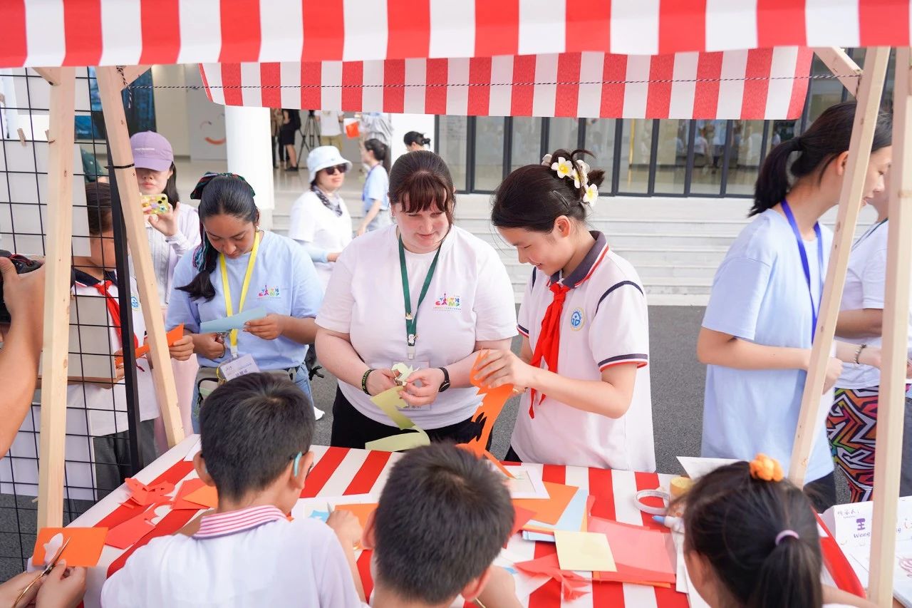开营式开始前,夏令营营员和学生志愿者参加了来自普陀区10所学校精心准备的非遗集市活动。中外青少年们饶有趣味地与灯彩、竹丝编、剪纸、风筝、朱氏绳艺等非遗项目传承人进行学习体验,感受中华非遗文化的魅力。现场,由普陀学生带来的欢腾热闹的中国鼓《秦王点兵》和舞龙舞狮表演,吸引外国营员们纷纷驻足,与现场表演的学生互动。