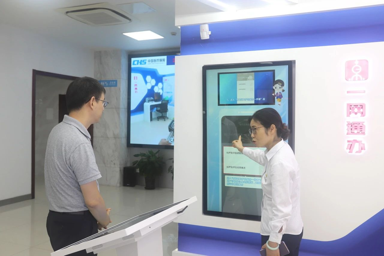 走访后,王国栋一行人参观了普陀区医保中心服务大厅数字医保体验区,听取了普陀医保智能化应用场景的相关介绍,并通过应用网办项目体验程序,了解“随申办APP普陀旗舰店”“长护险服务一件事”的操作流程。