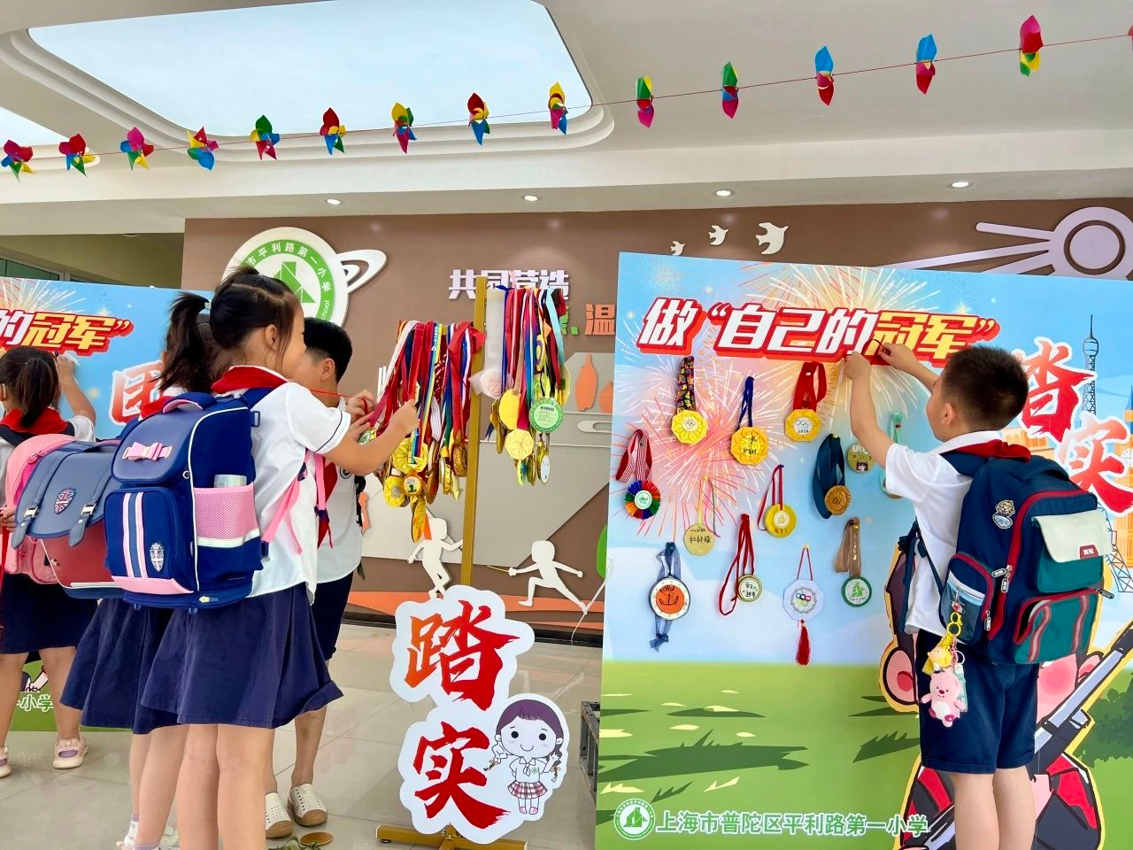 平利路第一小学的学生们胸前都悬挂着闪亮的金牌踏入校门,这些由孩子们亲手制作的金牌背面,写着他们新学期的梦想与目标。真如第三小学整合奥运热点,以爱眼护眼为主题,开展个性化“真如三宝夺‘睛’”闯关游园会,集章成功的孩子,享绿豆汤与祝福“金牌”。新普陀小学的学生们则兴奋地从“时光魔盒”里抽取奥运金牌卡,带着奥运健儿的拼搏精神,展望新学期的到来。