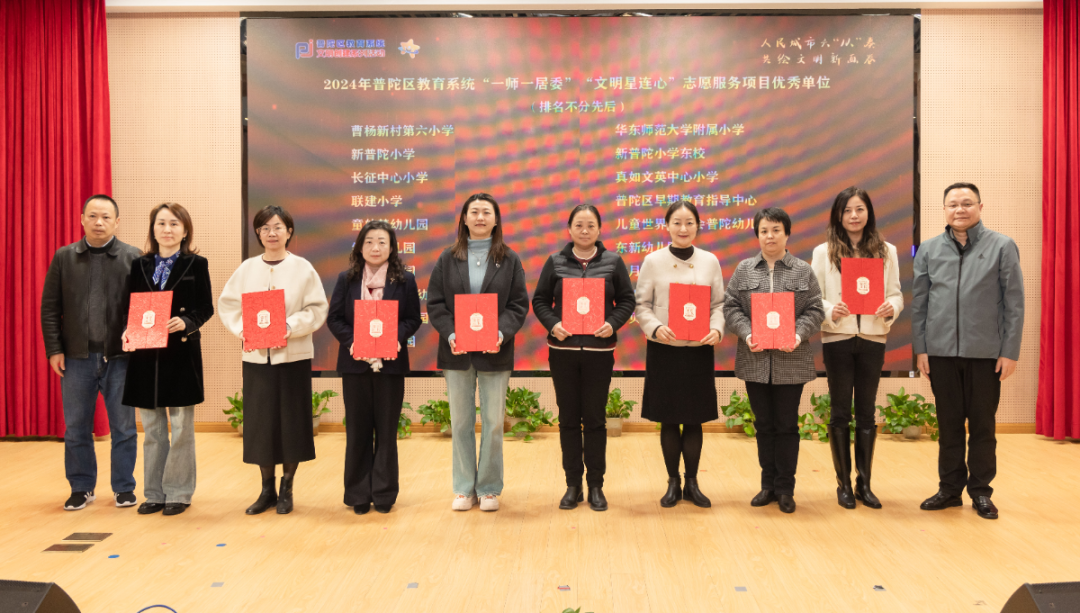 区教育系统组织开展的“人民教师进社区”志愿服务项目被列为2024年普陀区“人民城市六从奏,共绘文明新画卷”群众性主题活动品牌项目之一。活动现场,与会领导分别为区教育系统志愿服务先进典型、“一师一居委”“文明星连心”志愿服务项目优秀单位颁发证书,为25家普陀区“星星”守护联盟爱心公益单位颁牌并表示感谢。
