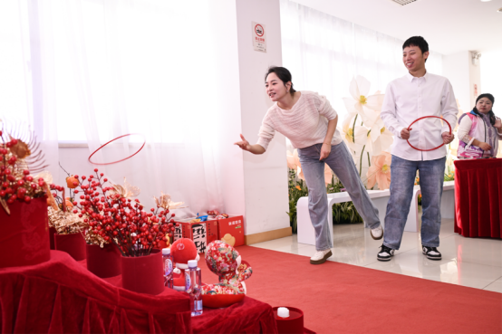 普陀婚登中心还为新人们安排了“圈住幸福,拥抱2025”元旦主题颁证活动,让当天现场的新人们体验到了满满的节日感、仪式感、幸福感。结婚登记大厅内,前来登记的新人络绎不绝。在“爱的抱抱桶”甜蜜互动游戏中,新人用手中的“幸福圈圈”套住2025年的第一桶满满幸福。通过新人的同心巧思,对幸福桶进行“细加工”,裁剪、搭配,拼插,在新人的默契配合、巧手加持下,独一无二的“幸福桶”制作完成,幸福桶满载新人对未来生活的美好愿望,受到新人们的由衷喜爱。