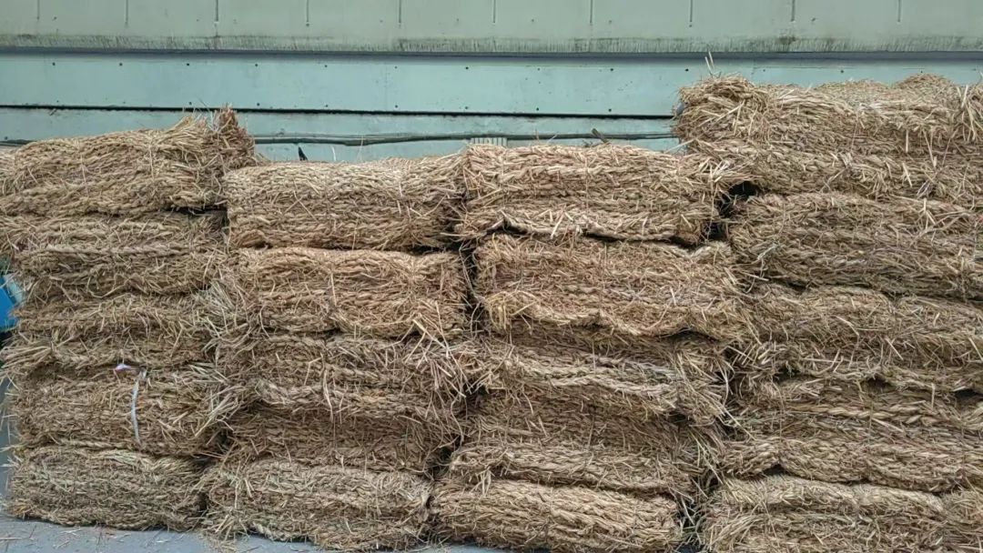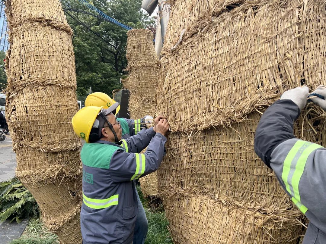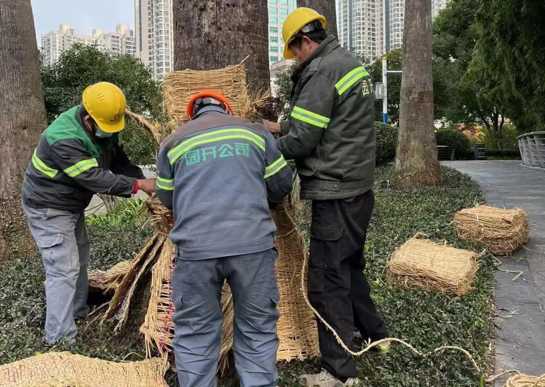 在靠近苏州河长寿段,记者看到,多名绿化养护工正在对树木进行保护作业,三名工人围拢在粗壮的铁树、棕榈树前,用稻草皮将树根主干结实地包扎起来帮助他们过冬。