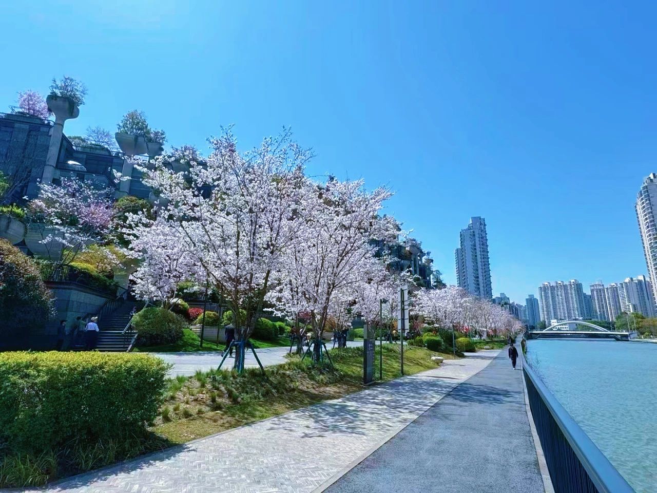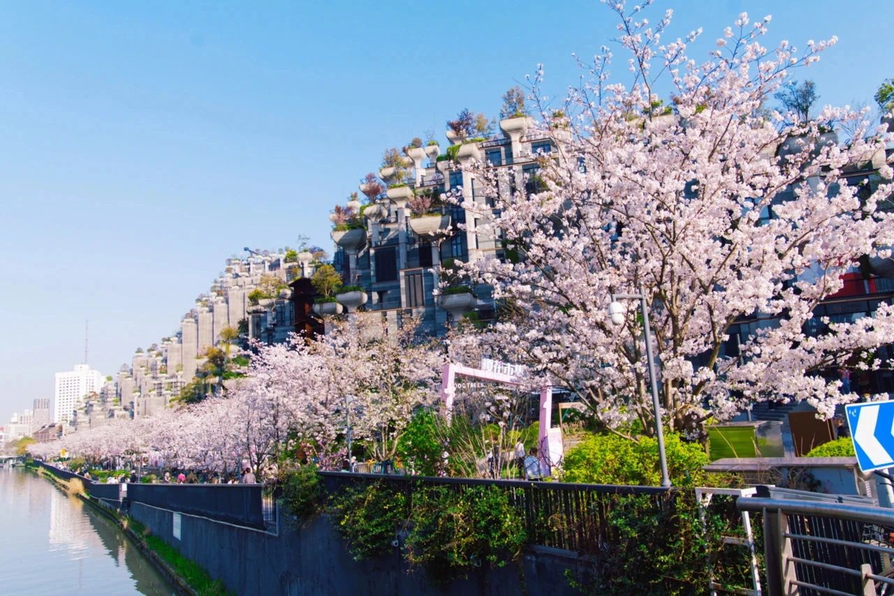 “春来无事,只为花忙”,大洋晶典天安千树的樱花步道在2022年春天亮相,从昌化路一直延伸到天安千树二期,全长900米,栽种了70余株樱花。樱花主要品种为染井吉野樱,盛放期到来的时候,在千树外墙万棵绿植的衬托下,樱花更显得娇嫩。漫步于此,既能窥得樱花飞舞间的风光,亦能欣赏苏州河畔的蜿蜒秀美。
