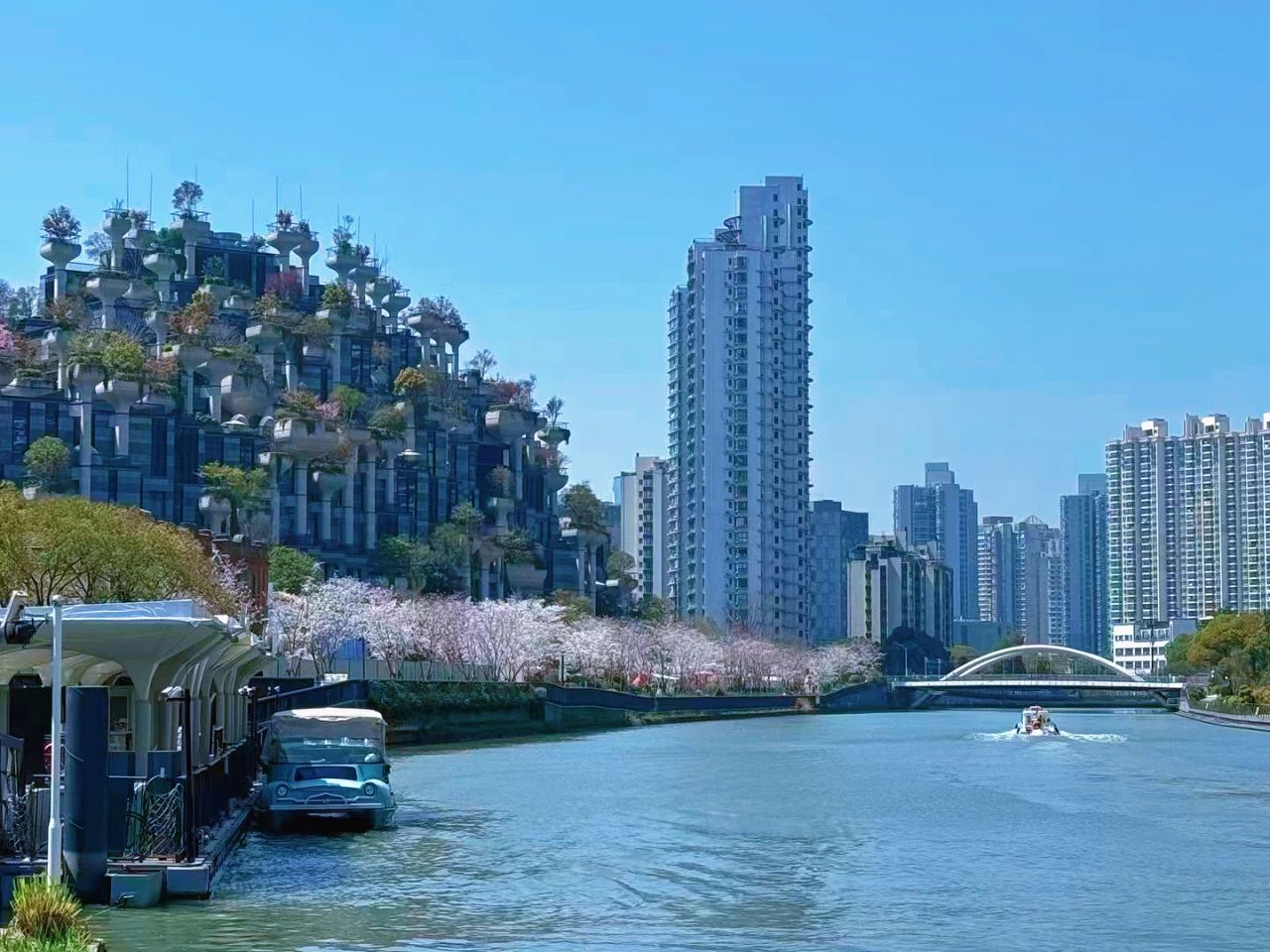 苏州河游船方面介绍,当游船从昌化路桥折返时会降低船速,并在安全条件允许的情况下尽可能靠近堤岸,游客坐在船上便可近距离欣赏樱花纷飞。流淌的苏州河,延绵的樱花,倒映水面的千树景观……一张独特的“朋友圈”打卡照便在一声快门中锁定。