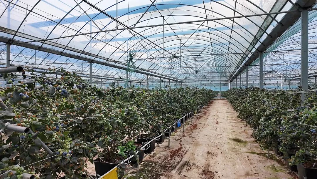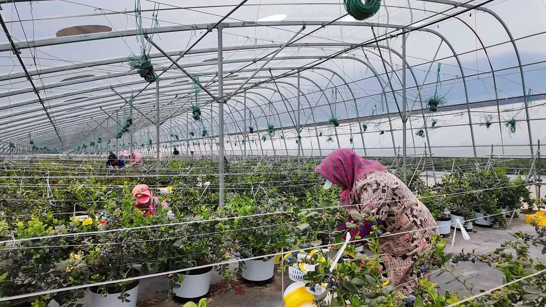 乡村振兴,产业振兴是关键。东川小江沿线河谷地貌独特,气候宜人、光照强烈,为蓝莓栽种提供了良好条件。自2022年起,上海帮扶资金在当地陆续建成75000多平方米的智慧大棚,因地制宜发展现代高效农业。适宜的气候、专业的大棚,使得东川冬季蓝莓11月底便可抢先上市,采收周期延迟至4月底,较传统土培种植延长约一个月采摘期。