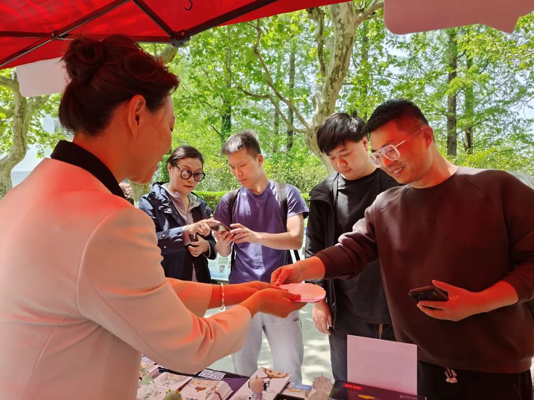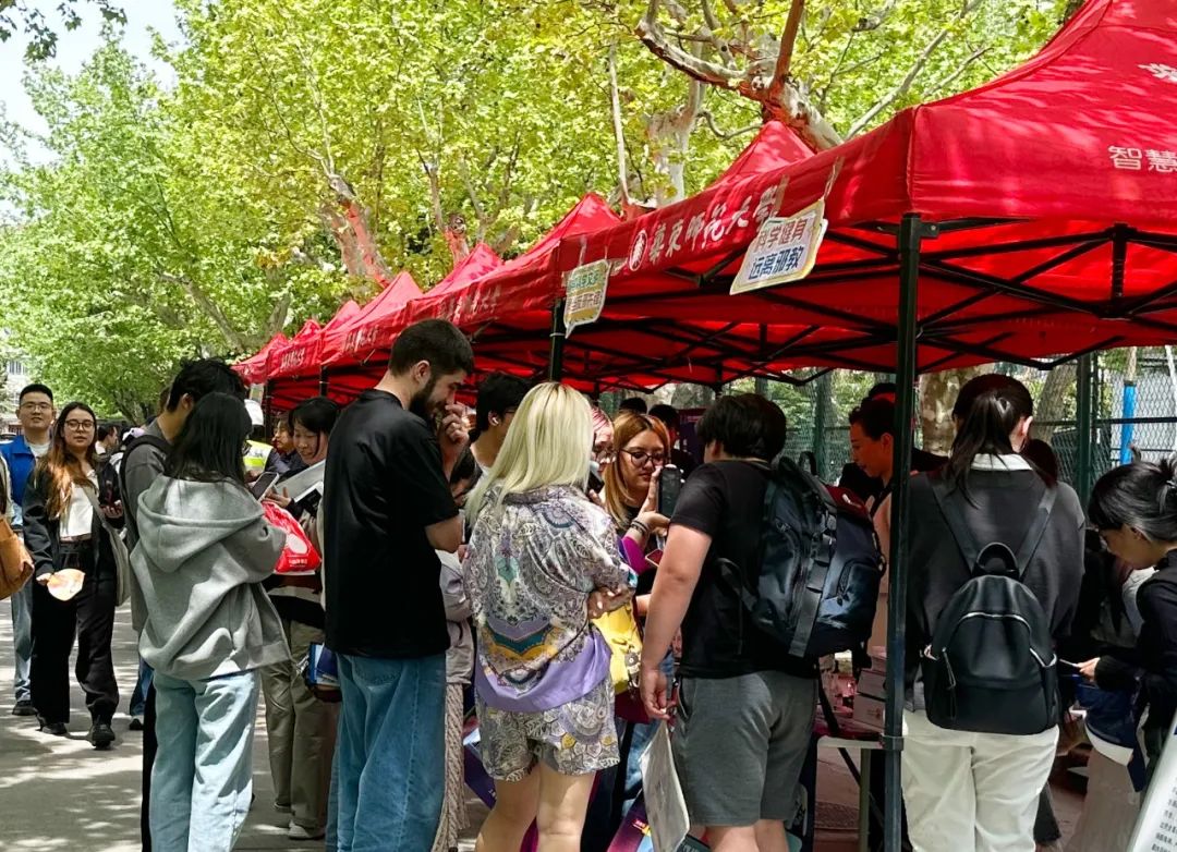 4月16日,河西餐厅门口路两侧人头攒动,热闹非凡。一场集法治宣讲、安全体验于一体的集市吸引了众多师生的目光。在普陀区委政法委反邪教宣传展台前,学生们驻足观看警示案例展板,工作人员则在一旁耐心细致地向同学们讲解邪教的危害和防范知识。“邪教披着伪装的外衣,常常利用网络平台蛊惑人心,大学生要擦亮眼睛,增强辨别能力。”展台内还设置了扫码答题和打卡盖章的互动环节,同学们纷纷拿出手机参与知识问答,并在集章卡上留下印记,现场气氛热烈而有序。在消防支队的展位前,一辆红色的消防车格外醒目。消防员们现场演示了消防器材的使用方法,并讲解了火灾预防和逃生自救知识,让同学们在近距离接触中学习消防安全技能。