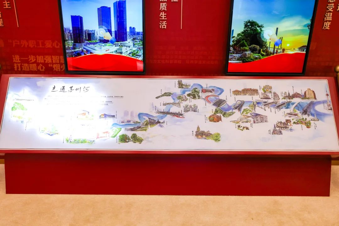 穿过独具“海派韵味”的石库门,走进“人民之城”展厅,首先映入眼帘的便是手绘长卷《走通苏州河》。M50创意园、创享塔、古北路桥、福新面粉厂旧址……苏州河畔的一个个“普陀元素”,如同漫天繁星,将整座城市的历史记忆与绵长文脉串联起来,记录着社会变迁与时代发展中的普陀故事。