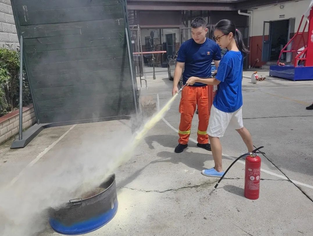 走向户外,小学员们迎来了最期待的环节,在消防员哥哥的指导协助下使用消防水枪和灭火器。经过培训,小学员们踊跃参与,体验“大号水枪”的威力,学习灭火设备的使用方法,在收获快乐的同时,提高了消防安全技能。紧接着,消防员哥哥演示了用专业的梯子在墙体外侧攀登居民楼,矫健的身手引得大家赞叹。小学员们也纷纷摩拳擦掌,在穿戴好安全设备后,体验了攀登消防云梯,消防员们也为他们的勇敢竖起了大拇指。