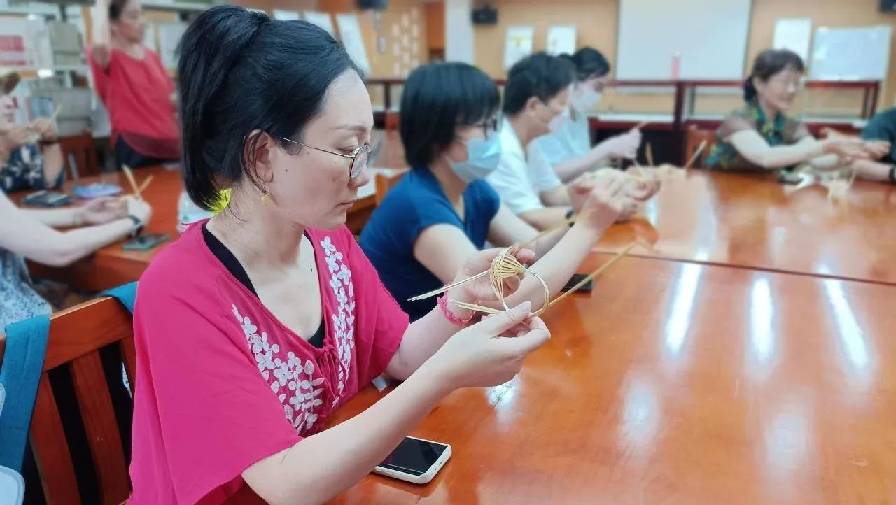 竹编老师先给参与居民介绍竹编文化,接着就开始动手采用挑一压一的技法立体编织。期间可用胶带辅助固定,还可以适当喷水增加竹篾之间的摩擦力。发簪主体编织完成后,剪去多余竹篾,收尾处用502胶水加固。一个精致素雅的竹编发簪就完成了。制作结束后,大家都纷纷展示出自己的作品并相互点评点赞。