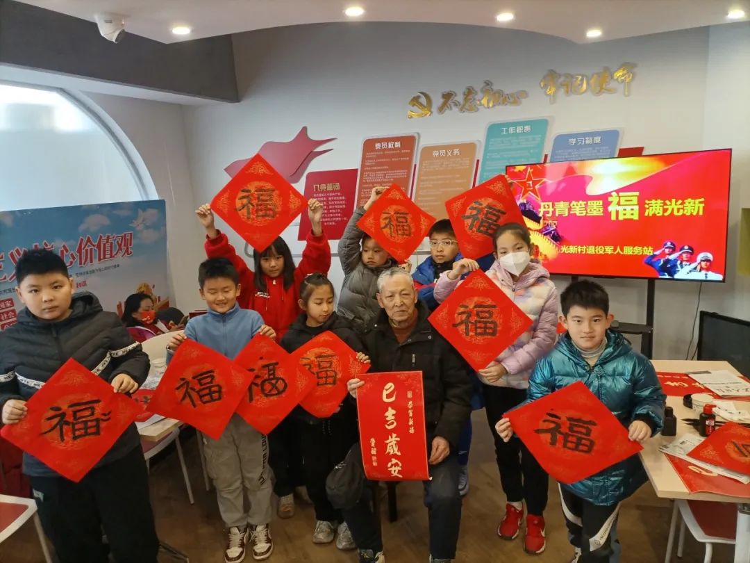 在光新居民区,青少年们齐聚一堂学习写福字,在书法老师指导下,他们认真挥毫,写下最好的“福”。随后,青少年们将写好的“福”字送给了小区退役军人代表陈志祥、王昌麟,老兵们的脸上洋溢着幸福。