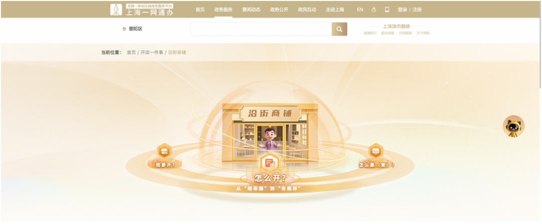 登录上海市 “一网通办” 官网,选择普陀区进入“开店一件事全生命周期服务专区”,根据店铺类型(沿街商铺/商业综合体)一键进入办理页面。这里不仅有可视化地图选址、智能流程模拟,更能生成专属办事指南,材料预审、表单助填等功能全程护航,让您轻点屏幕,就能解锁开店全流程。