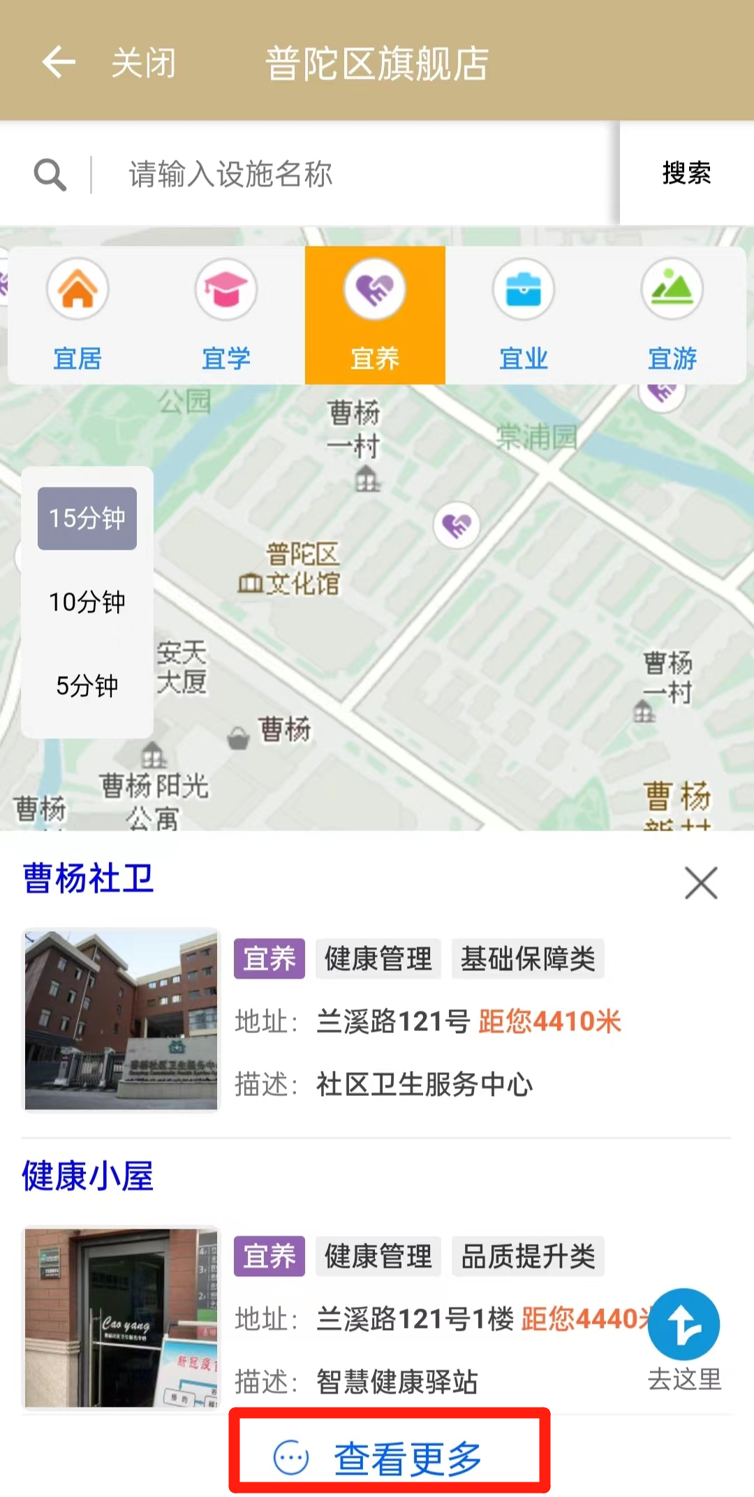 第三步:居民根据自身需求,可以轻松地找到曹杨社区中现有的宜居、宜业、宜游、宜学、宜养五类设施点以及实用的生活信息。此外,在《地图》中,居民还可以通过选择“5分钟”“10分钟”以及“15分钟”三个步行可达圈层,查看周围不同时间圈层内的设施点位,并通过导航功能一键查询路线。同时,动态查询地图还提供搜索功能,居民可通过搜索设施的名称,了解相关信息。