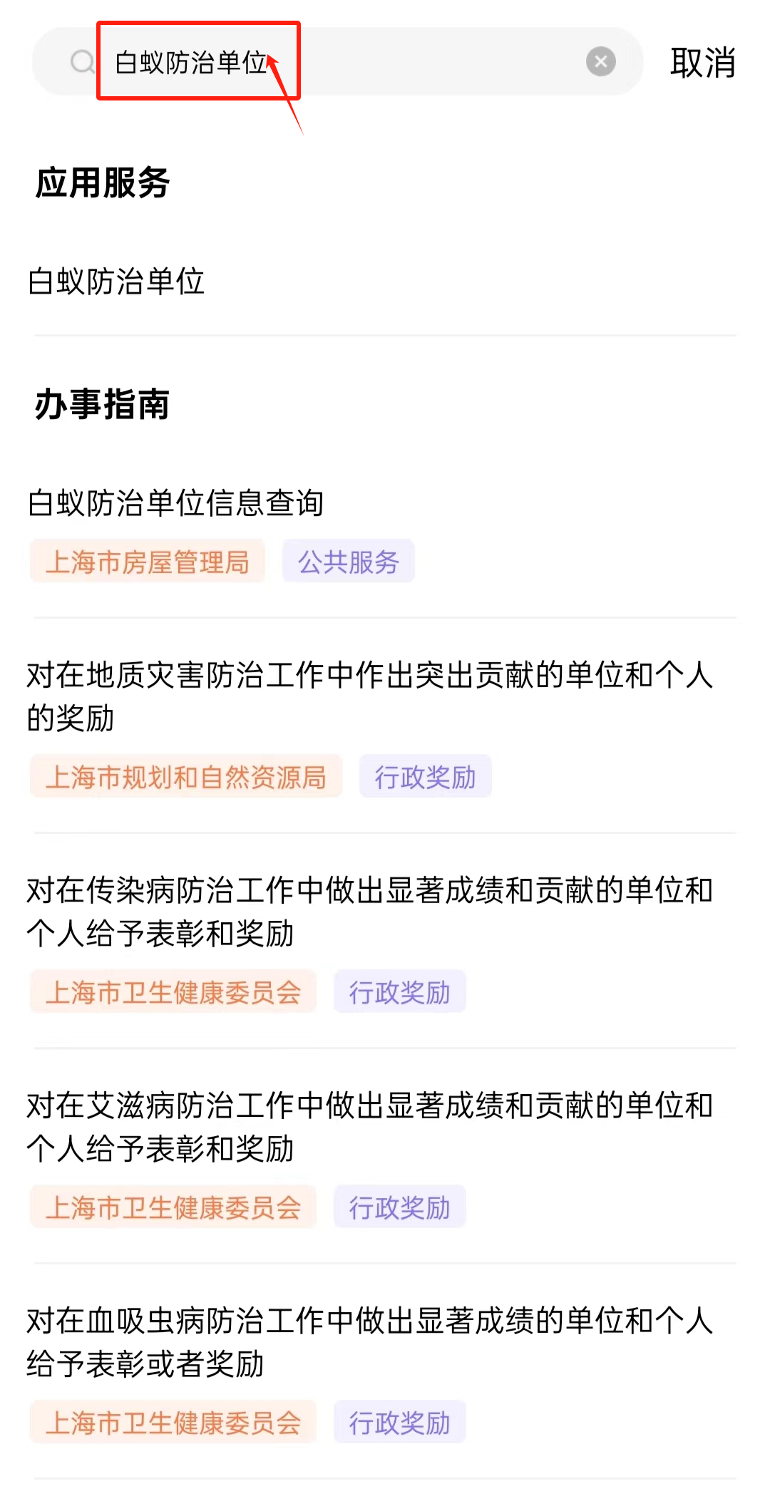 第二步:在搜索服务事项栏中输入“白蚁防治单位”,可按行政区查询白蚁防治企业。例如,普陀居民可以选择“普陀区”,便可查询白蚁防治企业的联系电话、收费标准等。