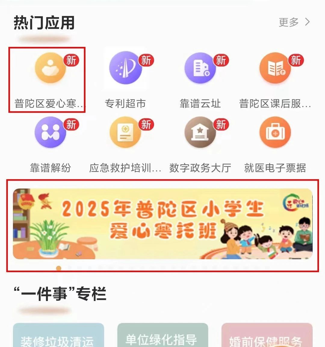 1.2025年1月1日9:00至2025年1月3日9:00,登录“随申办市民云”APP,搜索“普陀旗舰店”,点击“2025年普陀区小学生爱心寒托班”。