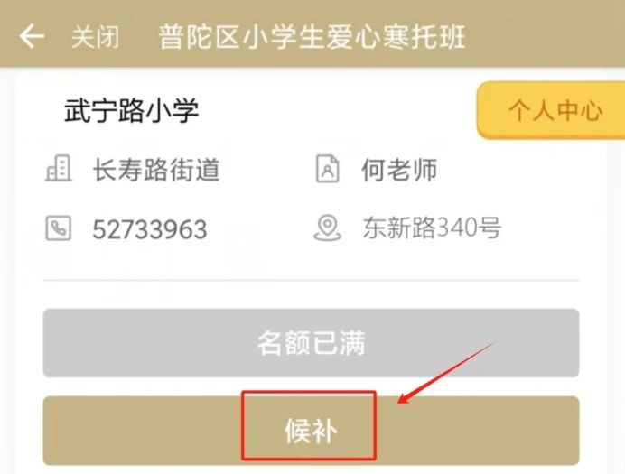 1.在名额报名已满的情况下,会弹出候补的选项,仍想要报名的家长可以找到想要报名的街镇入口,点击“候补”。