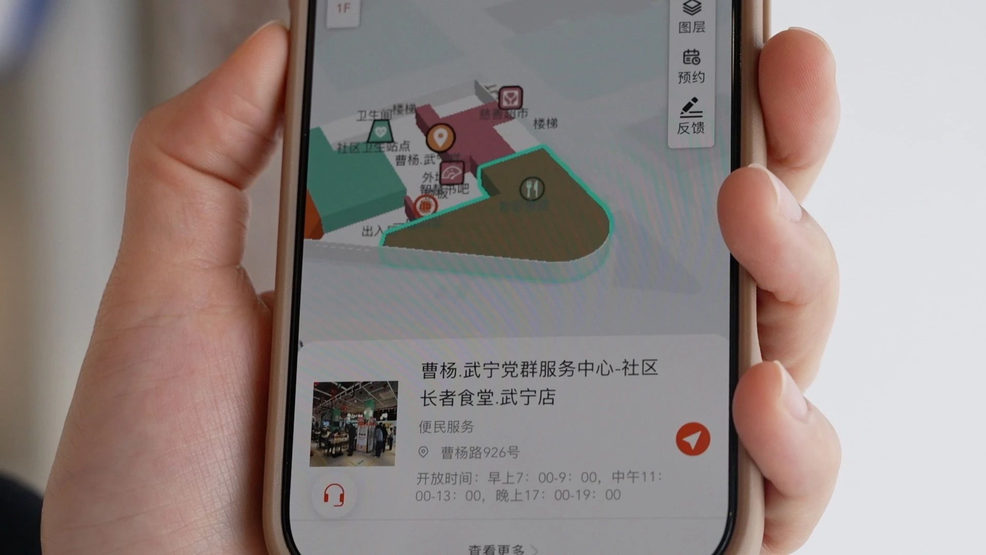 当天上线的“掌中宝”曹杨场景整合多类公共服务资源,打造全场景服务矩阵,目前已完成普陀区曹杨新村街道344处社区设施时空信息挂载,例如接入长者食堂菜单、活动室课程表等多项社区动态数据,让家长预约托育服务、老人预定餐食服务等实现“一站集成”,同时也对部分复合型设施构建了分层到间的“立体可穿透、服务可交互”数字三维模型。