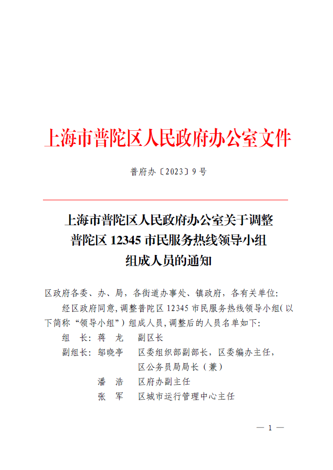 上海市普陀区人民政府办公室关于调整普陀区12345市民服务热线领导小组组成人员的通知