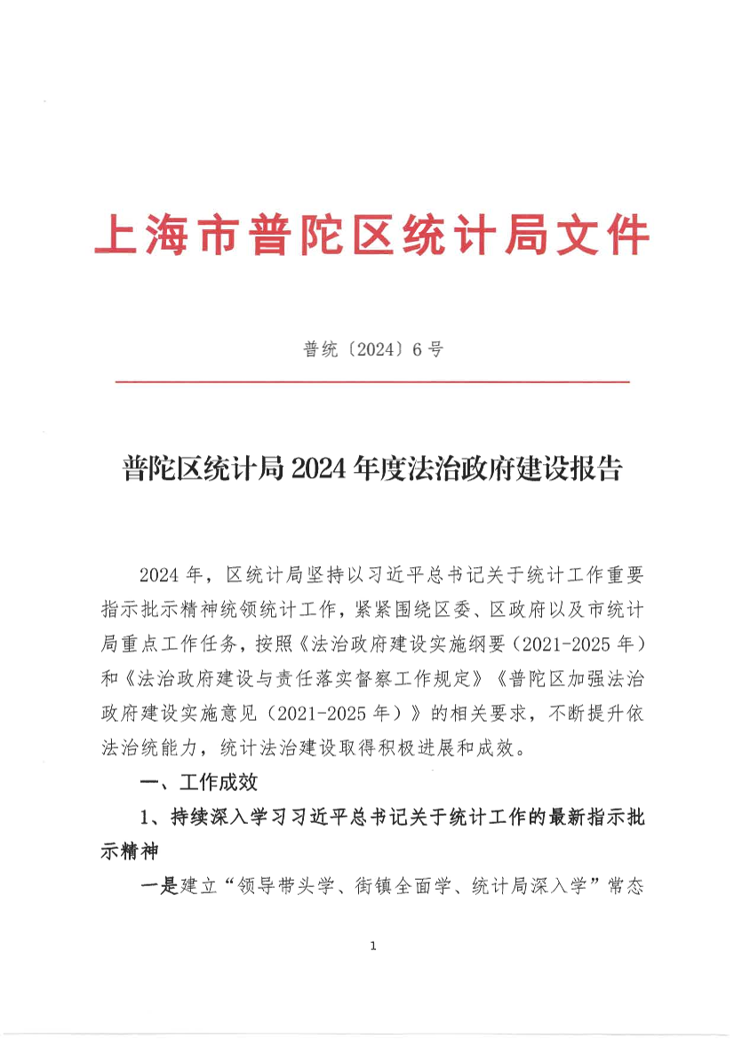 2024年,区统计局坚持以习近平总书记关于统计工作重要指示批示精神统领统计工作,紧紧围绕区委、区政府以及市统计局重点工作任务,按照《法治政府建设实施纲要(2021-2025年)和《法治政府建设与责任落实督察工作规定》《普陀区加强法治政府建设实施意见(2021-2025年)》的相关要求,不断提升依法治统能力,统计法治建设取得积极进展和成效。
