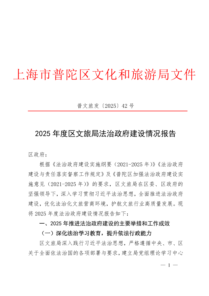 根据《法治政府建设实施纲要(2021-2025年)》《法治政府建设与责任落实督察工作规定》及《普陀区加强法治政府建设实施意见(2021-2025年)》的要求,区文旅局在区委、区政府的坚强领导下,深入学习贯彻习近平法治思想,全面推进法治政府建设,优化法治化文旅营商环境,护航文旅行业高质量发展。现将2025年度法治政府建设情况报告如下:
