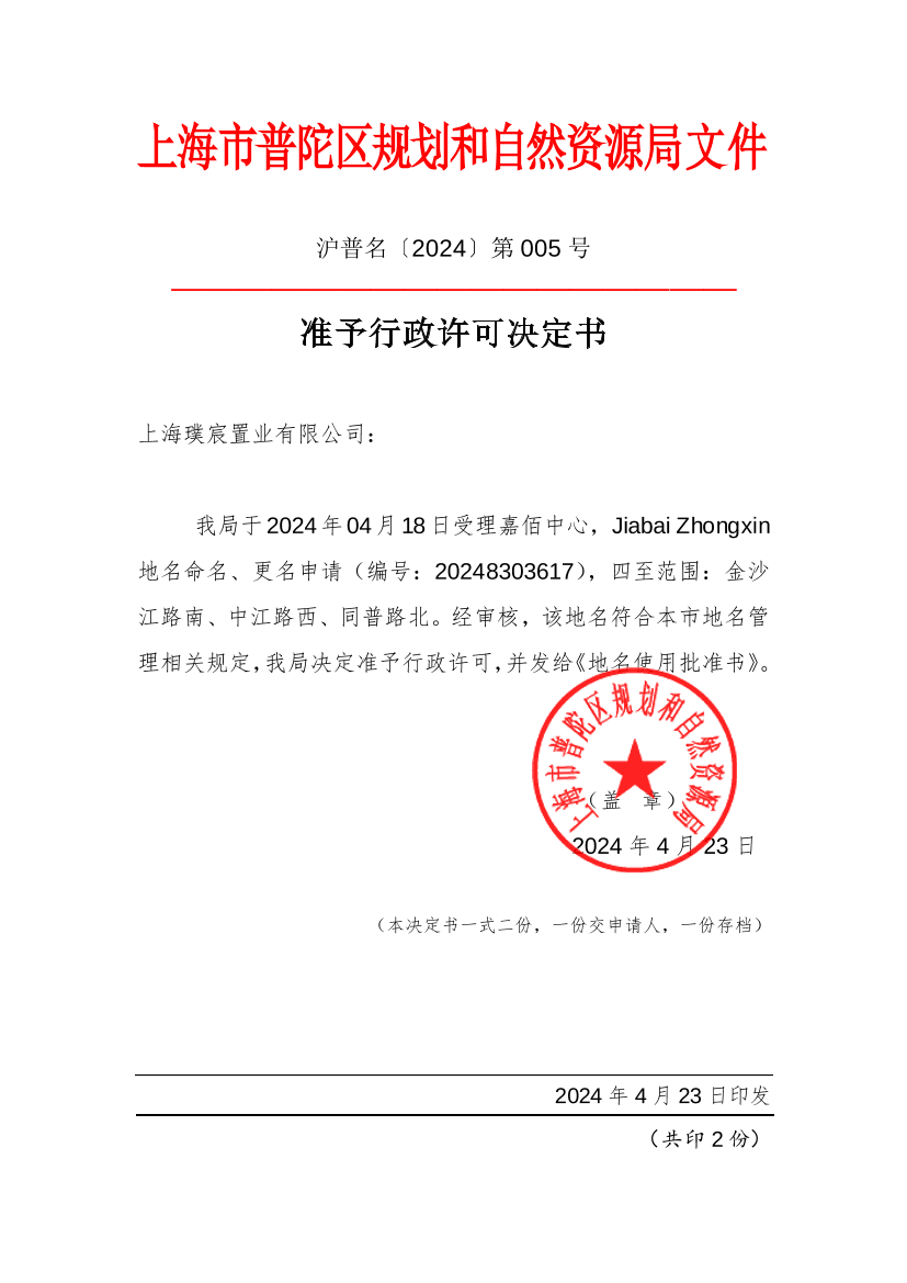 我局于2024年04月18日受理嘉佰中心,Jiabai Zhongxin地名命名、更名申请(编号:20248303617),四至范围:金沙江路南、中江路西、同普路北。经审核,该地名符合本市地名管理相关规定,我局决定准予行政许可,并发给《地名使用批准书》。
