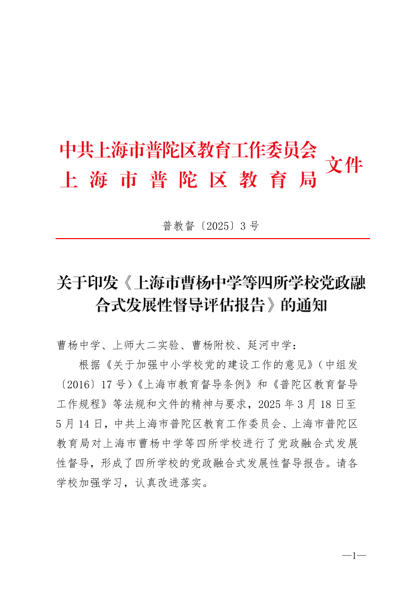 根据《关于加强中小学校党的建设工作的意见》(中组发〔2016〕17号)《上海市教育督导条例》和《普陀区教育督导工作规程》等法规和文件的精神与要求,2025年3月18日至5月14日,中共上海市普陀区教育工作委员会、上海市普陀区教育局对上海市曹杨中学等四所学校进行了党政融合式发展性督导,形成了四所学校的党政融合式发展性督导报告。请各学校加强学习,认真改进落实。