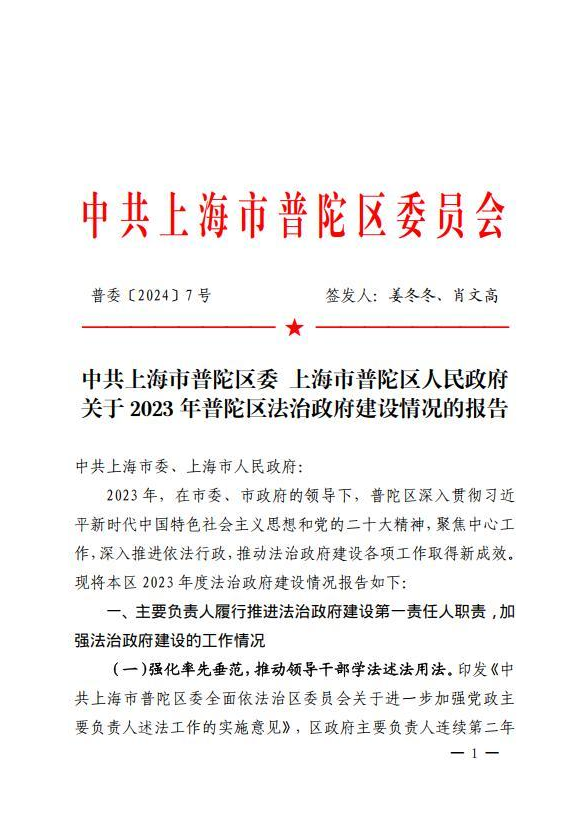 中共上海市普陀区委 上海市普陀区人民政府关于2023年普陀区法治政府建设情况的报告