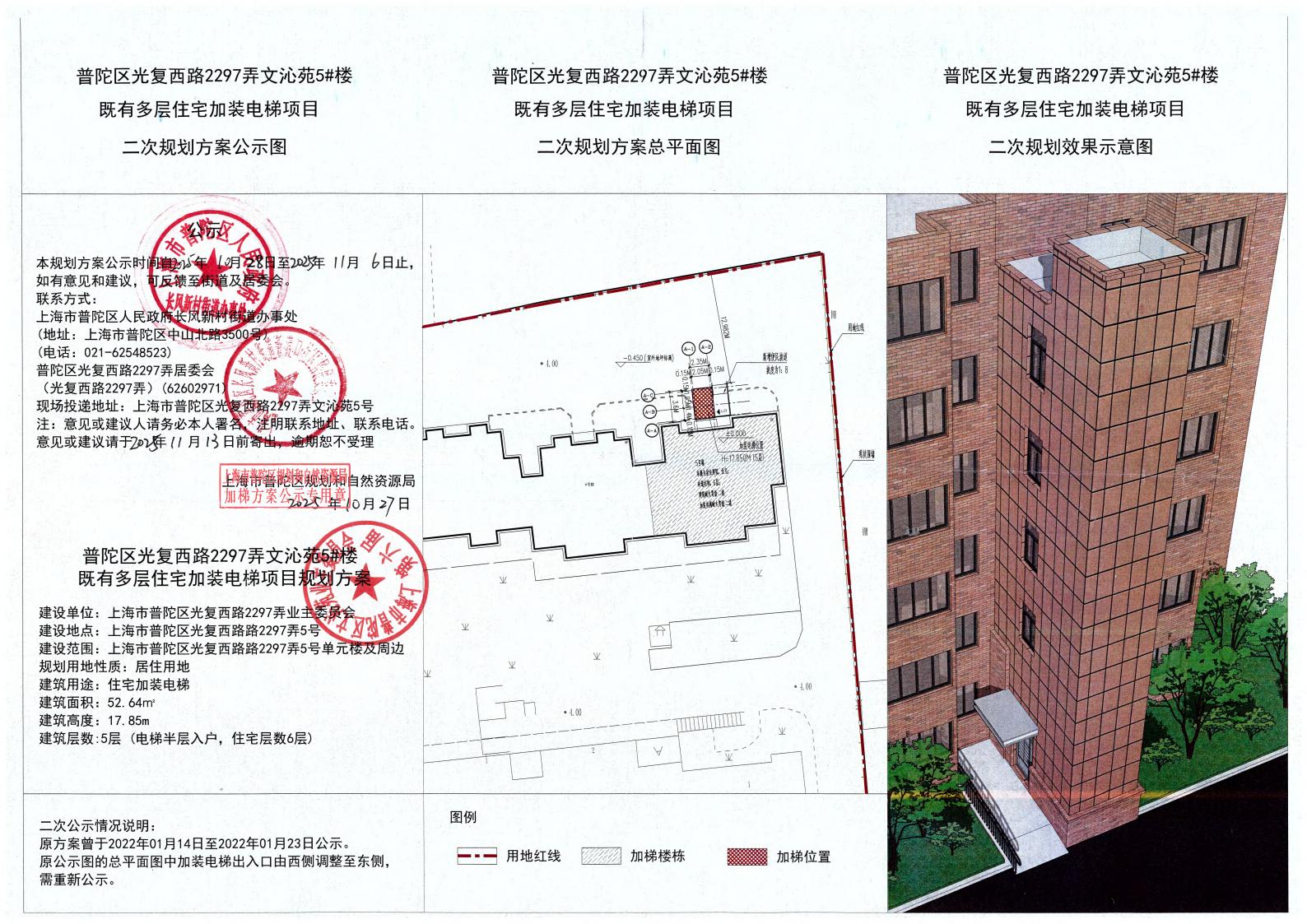 普陀区光复西路2297弄文沁苑5#楼既有多层住宅加装电梯项目二次规划方案公示