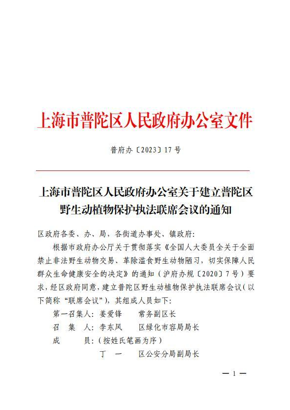 根据市政府办公厅关于贯彻落实《全国人大委员全关于全面禁止非法野生动物交易、革除滥食野生动物陋习,切实保障人民群众生命健康安全的决定》的通知(沪府办规〔2020〕7号)要求,经区政府同意,建立普陀区野生动植物保护执法联席会议(以下简称“联席会议”),其组成人员如下: