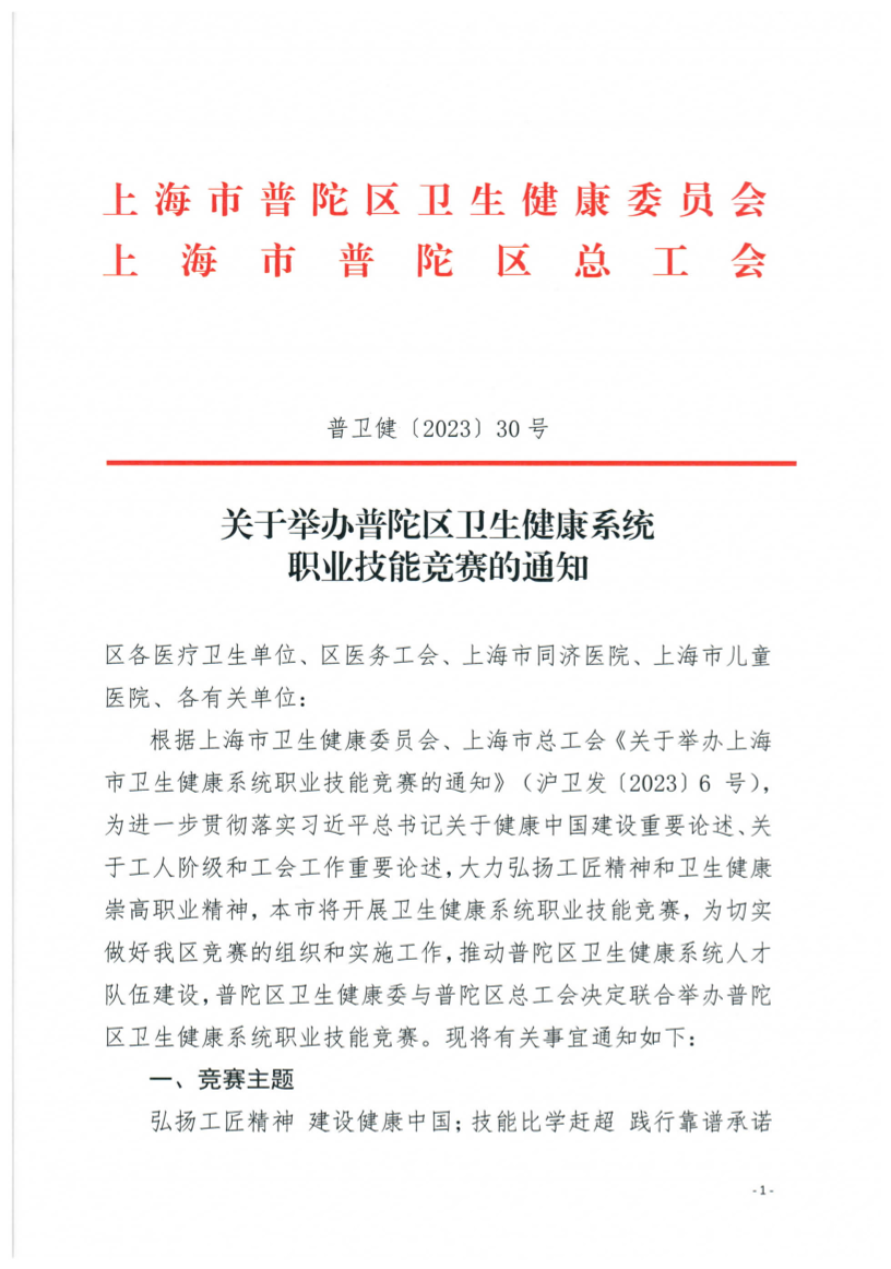 根据上海市卫生健康委员会、上海市总工会《关于举办上海市卫生健康系统职业技能竞赛的通知》(沪卫发〔2023〕6 号),为进一步贯彻落实习近平总书记关于健康中国建设重要论述、关于工人阶级和工会工作重要论述,大力弘扬工匠精神和卫生健康崇高职业精神,本市将开展卫生健康系统职业技能竞赛,为切实做好我区竞赛的组织和实施工作,推动普陀区卫生健康系统人才队伍建设,普陀区卫生健康委与普陀区总工会决定联合举办普陀区卫生健康系统职业技能竞赛。现将有关事宜通知如下: