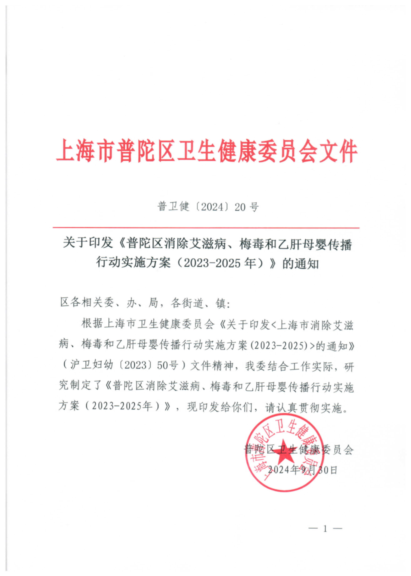 关于印发《普陀区消除艾滋病、梅毒和乙肝母婴传播行动实施方案(2023-2025年)》的通知