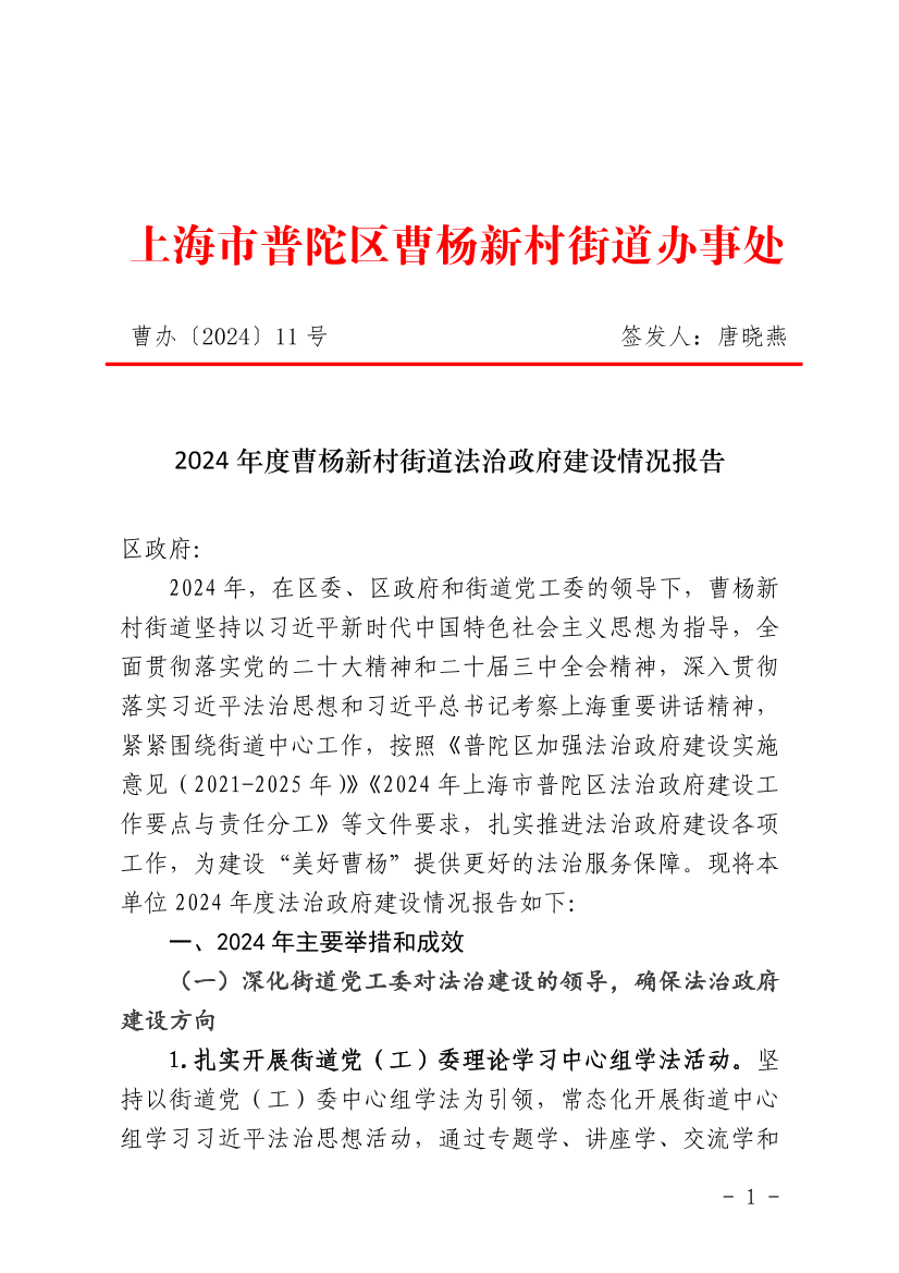 2024年,在区委、区政府和街道党工委的领导下,曹杨新村街道坚持以习近平新时代中国特色社会主义思想为指导,全面贯彻落实党的二十大精神和二十届三中全会精神,深入贯彻落实习近平法治思想和习近平总书记考察上海重要讲话精神,紧紧围绕街道中心工作,按照《普陀区加强法治政府建设实施意见(2021-2025年)》《2024年上海市普陀区法治政府建设工作要点与责任分工》等文件要求,扎实推进法治政府建设各项工作,为建设“美好曹杨”提供更好的法治服务保障。现将本单位2024年度法治政府建设情况报告如下: