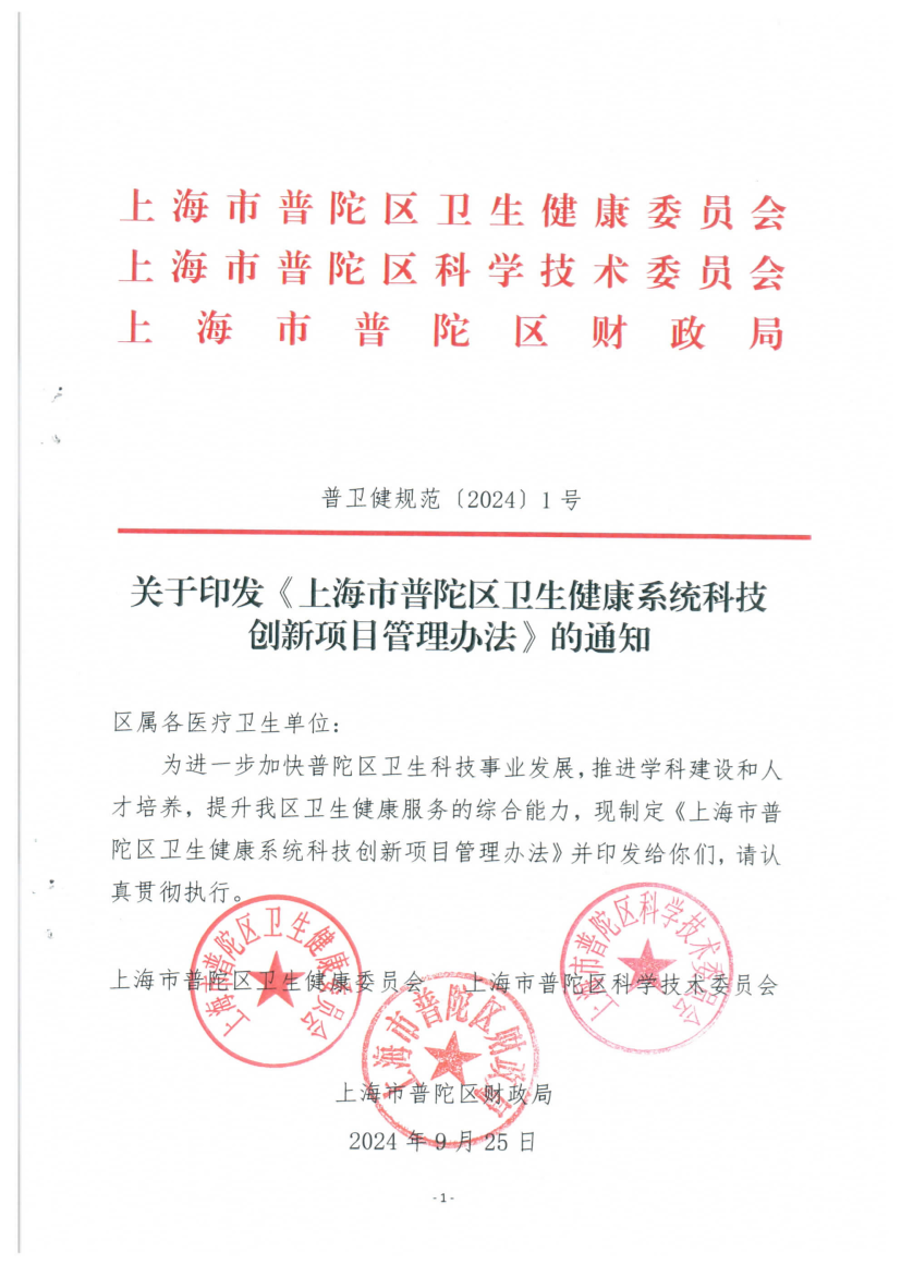 关于印发《上海市普陀区卫生健康系统科技创新项目管理办法》的通知