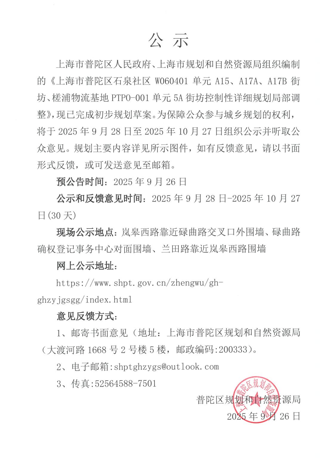 上海市普陀区石泉社区W060401单元A15、A17A、A17B街坊、槎浦物流基地PTP0-0001单元5A街坊控制性详细规划局部调整(公众参与草案)预公告