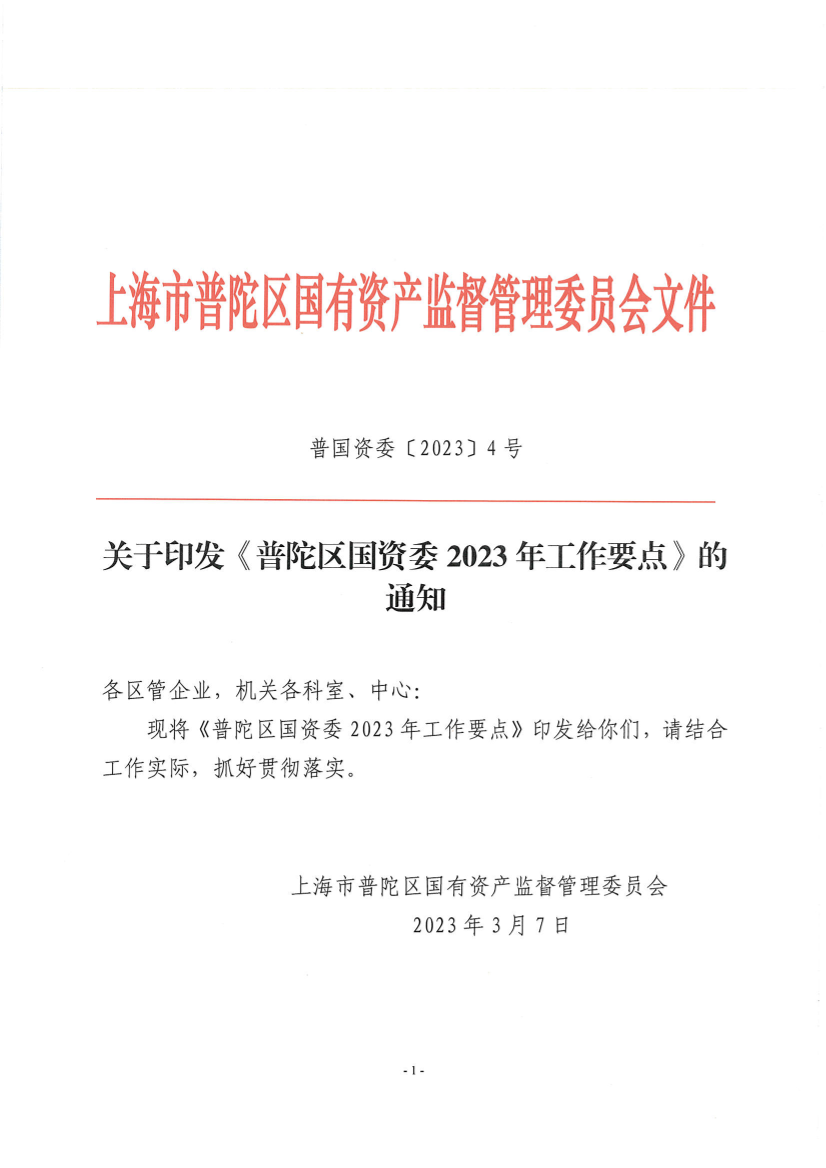 关于印发《普陀区国资委2023年工作要点》的通知
