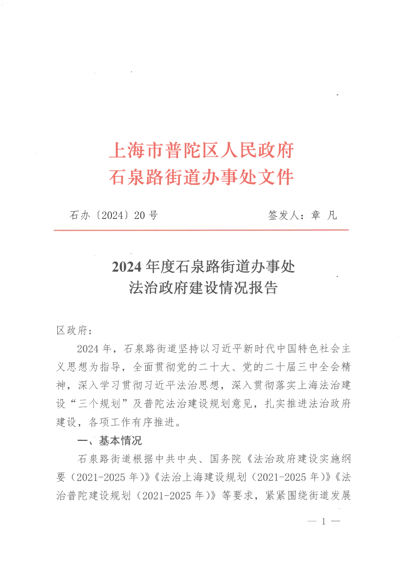 石泉路街道根据中共中央、国务院《法治政府建设实施纲要(2021-2025年)》《法治上海建设规划(2021-2025年)》《法治普陀建设规划(2021-2025年)》等要求,紧紧围绕街道发展大局,深入学习习近平法治思想、贯彻党的二十大精神、推进政府机构职能体制改革、加快转变政府职能、切实落实综合行政执法体制改革、推进依法行政、建设法治政府各项任务,促进政府各项工作全面纳入法治轨道,为街道经济社会发展营造了良好的法治环境和氛围。