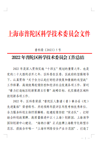2022年,区科委荣获“普陀区人靠谱(普)事办妥(陀)先进集体”荣誉称号,并连续两年获评区年度考核优秀单位。全力服务科创主体纾困解难,组建疫情防控“突击队”,打好助企科创政策牌。高质量推进中以(上海)创新园、上海清华国际创新中心建设。“海纳小镇”正式挂牌上海数字化转型示范区。获批全市唯一“上海市网络安全产业示范园”。打造了27个数字化转型示范项目和标杆场景,累计开通5G室外基站2388个,超额完成全年目标任务。全年完成首次认定高新技术企业76家,超额完成力争60家的年度目标任务。智能软件、研发服务两大产业合计实现区税20.6亿元,占区税比重21.64%,较去年同期提高4.25个百分点,超额完成占比合计提升两个百分点的年度目标任务。2022年统计年度,软件信息服务业实现营收713.72亿元,同比增长2.63%;科技服务业营收178.42亿元,同比增长18.33%。全年引进企业共计产税19615万元,区税6313.6万元;当年新落地企业296家,企业数指标完成达148%。