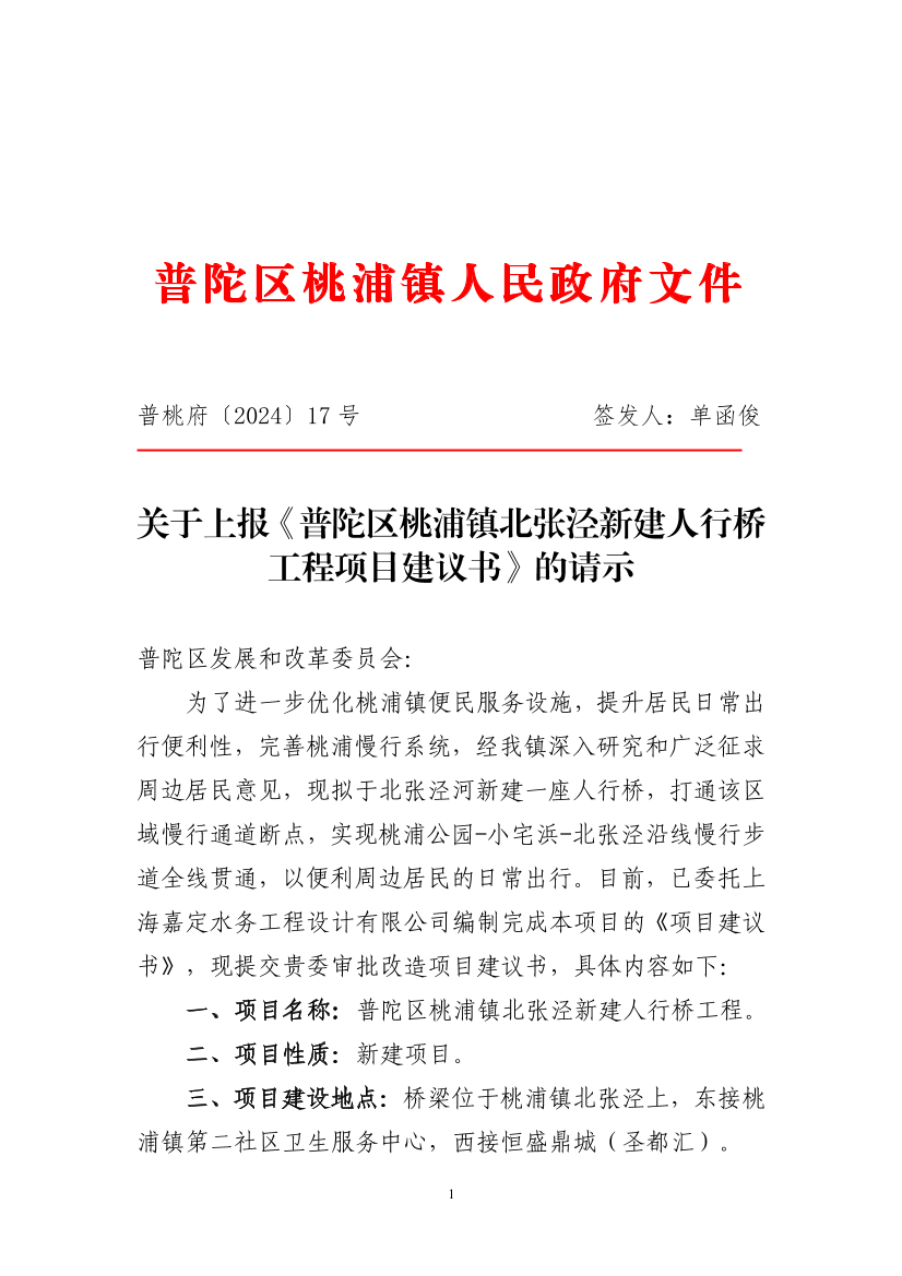 关于上报《普陀区桃浦镇北张泾新建人行桥工程项目建议书》的请示