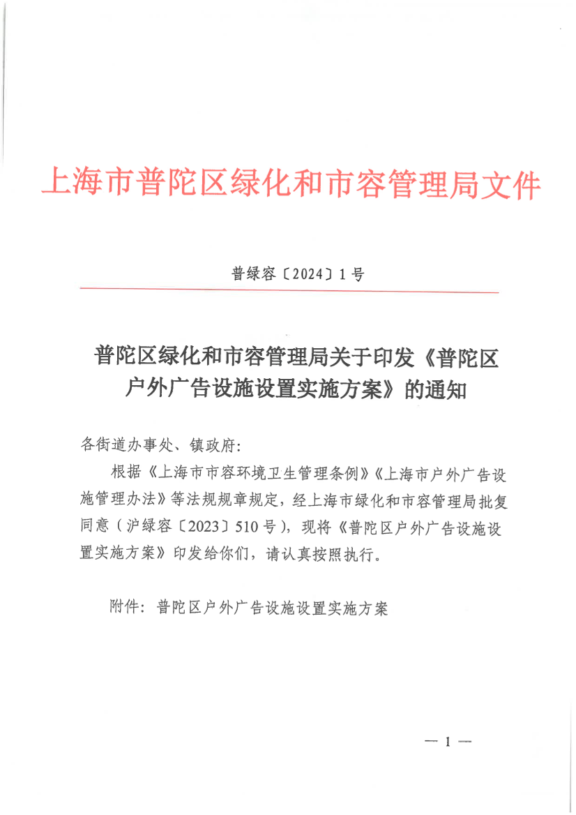 根据《上海市市容环境卫生管理条例》《上海市户外广告设施管理办法》等法规规章规定,经上海市绿化和市容管理局批复同意(沪绿容〔2023〕510号),现将《普陀区户外广告设施设置实施方案》印发给你们,请认真按照执行。