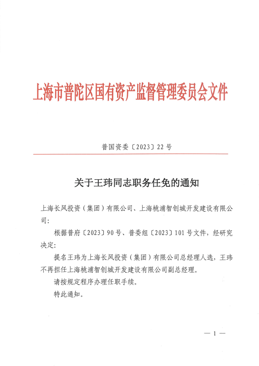 提名王玮为上海长风投资(集团)有限公司总经理人选,王玮不再担任上海桃浦智创城开发建设有限公司副总经理。