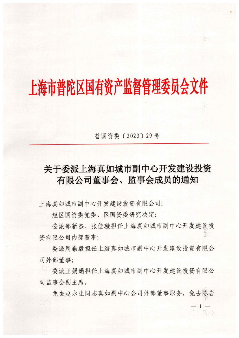 委派邵新杰、张佳璇担任上海真如城市副中心开发建设投资有限公司内部董事;