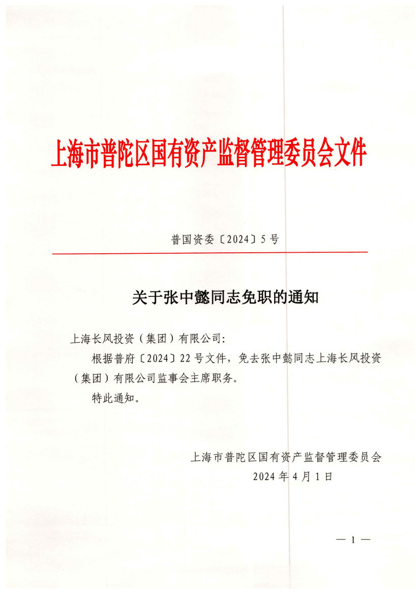 根据普府〔2024〕22号文件,免去张中懿同志上海长风投资(集团)有限公司监事会主席职务。