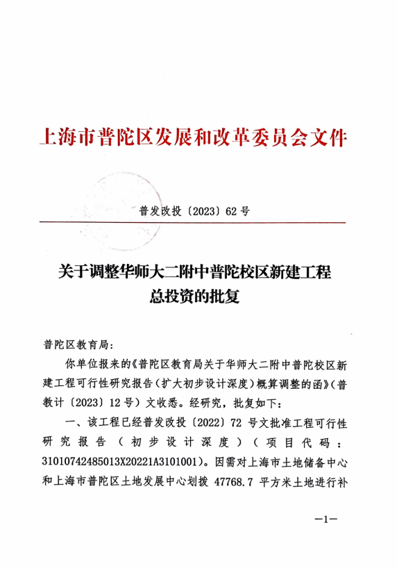 你单位报来的《普陀区教育局关于华师大二附中普陀校区新建工程可行性研究报告(扩大初步设计深度)概算调整的函》(普教计〔2023〕12号)文收悉。经研究,批复如下: