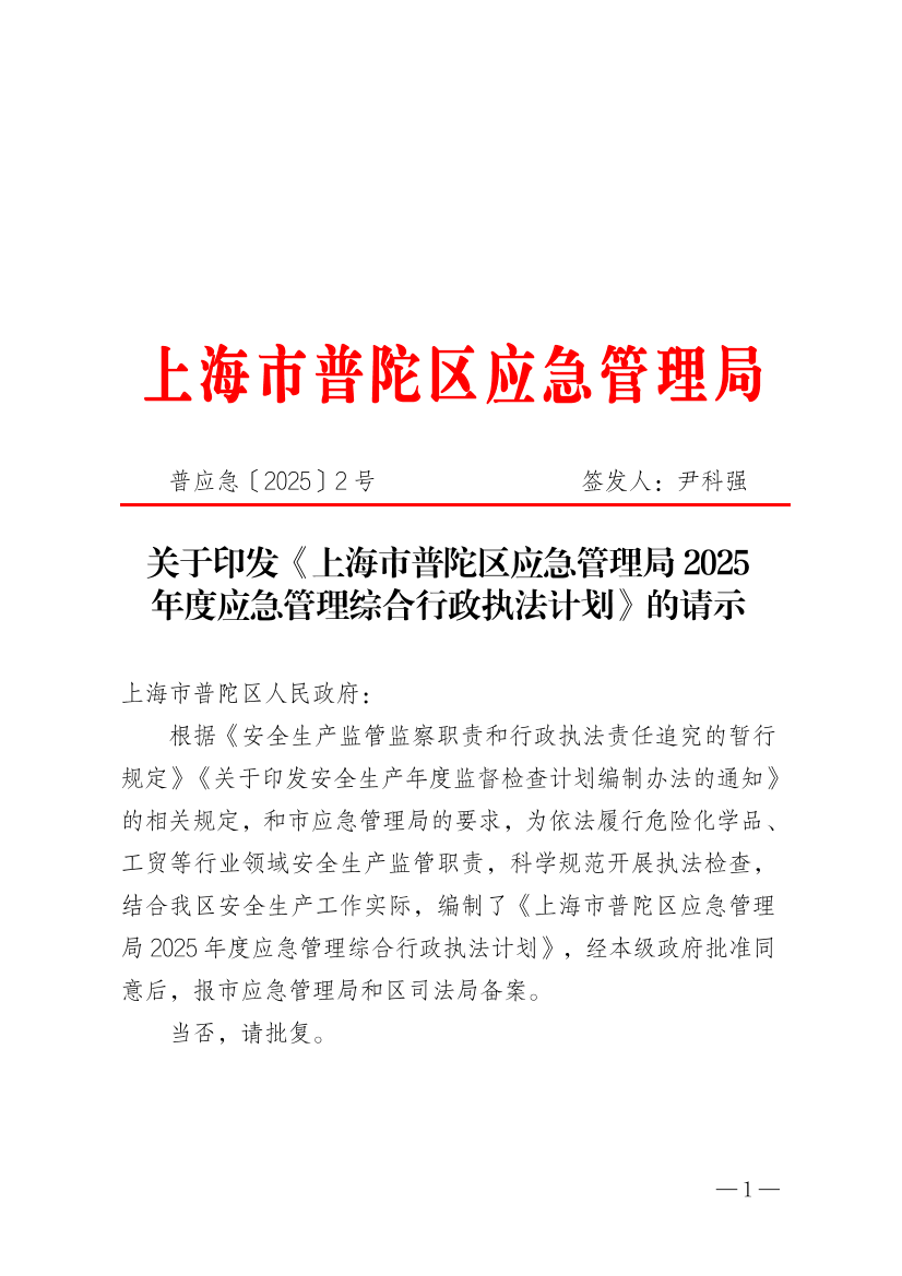 关于印发《上海市普陀区应急管理局2025 年度应急管理综合行政执法计划》的请示