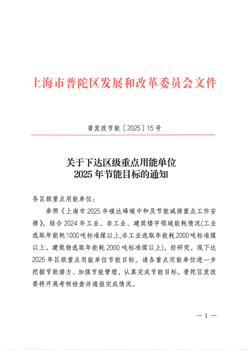 参照《上海市2025年碳达峰碳中和及节能减排重点工作安排》,结合2024年工业、非工业、建筑楼宇领域能耗情况(工业选取年能耗1000吨标准煤以上,非工业选取年能耗2000吨标准煤以上,建筑物选取年能耗2000吨标准煤以上),经研究,现下达2025年区级重点用能单位节能目标。请各重点用能单位进一步挖掘节能潜力、加强节能管理,认真完成节能目标,普陀区发改委将开展考核检查并通报完成情况。