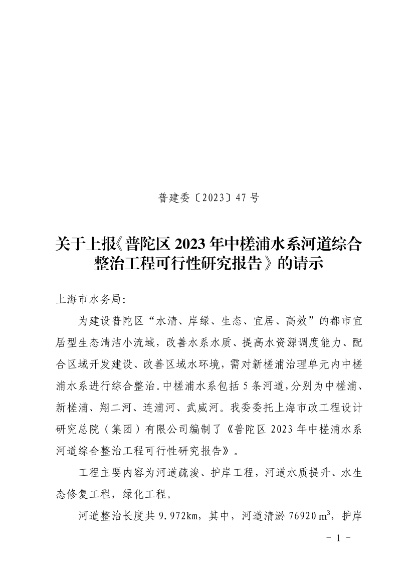 关于上报《普陀区2023年中槎浦水系河道综合整治工程可行性研究报告》的请示