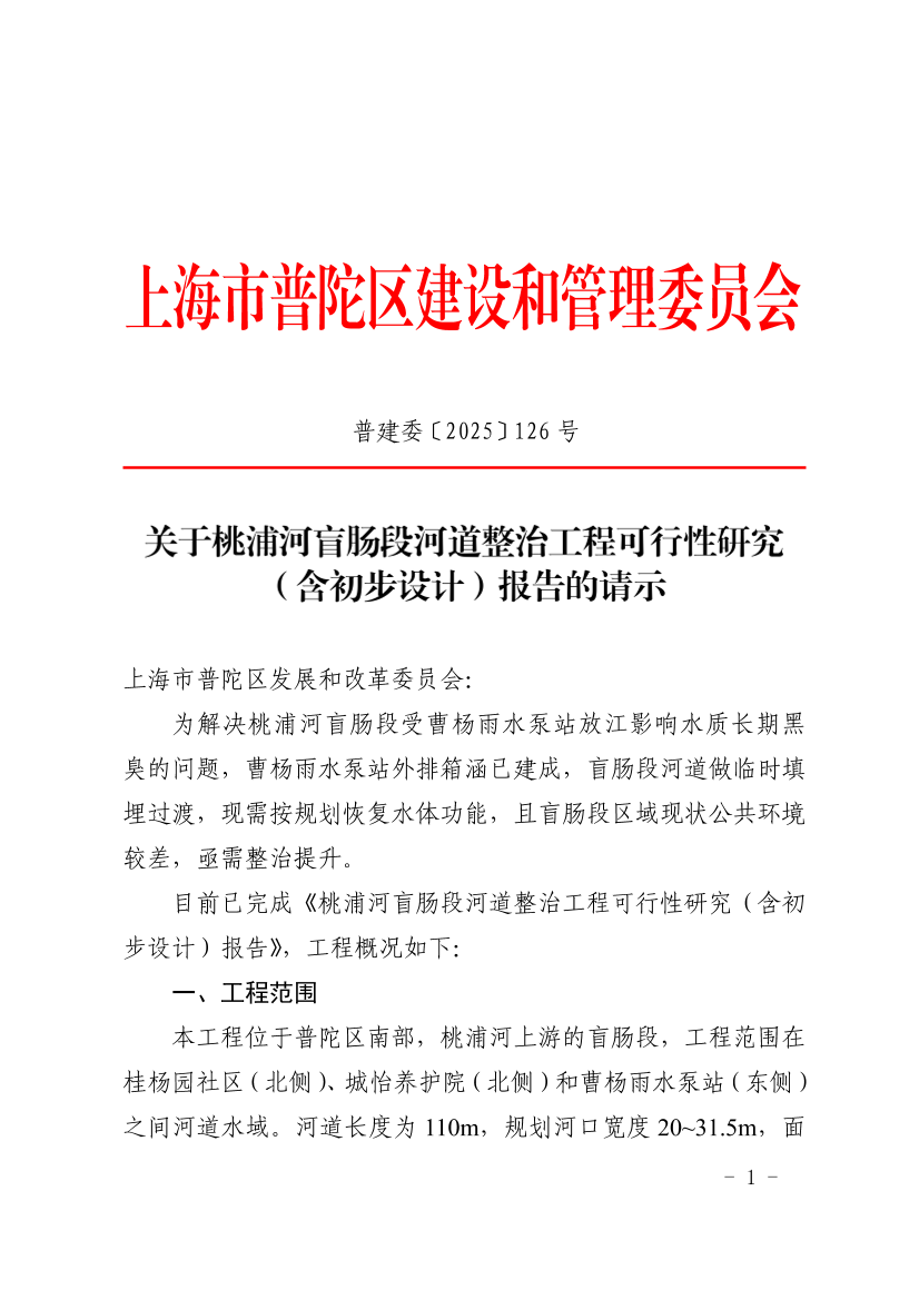 关于桃浦河盲肠段河道整治工程可行性研究(含初步设计)报告的请示