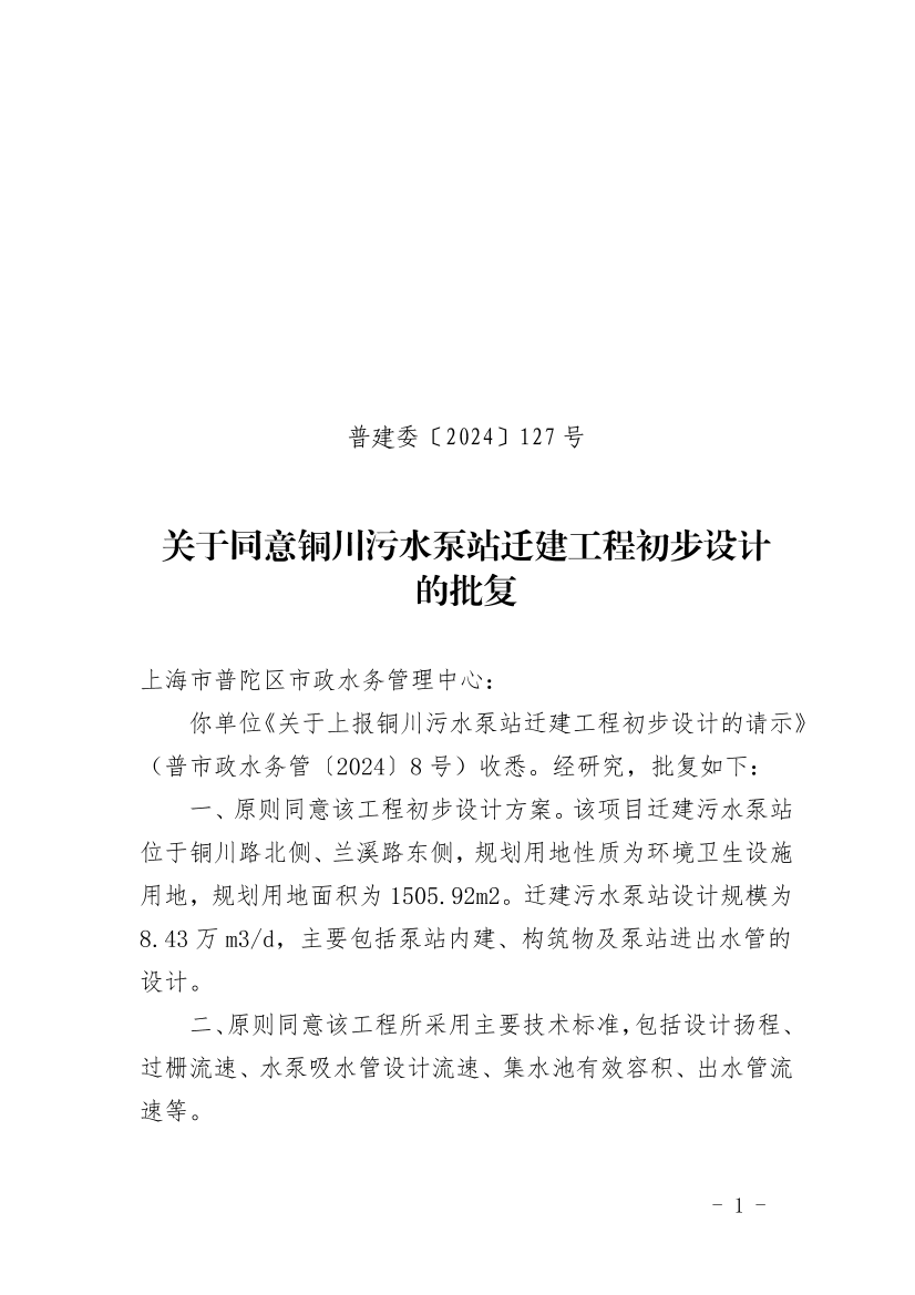 你单位《关于上报铜川污水泵站迁建工程初步设计的请示》(普市政水务管〔2024〕8号)收悉。经研究,批复如下: