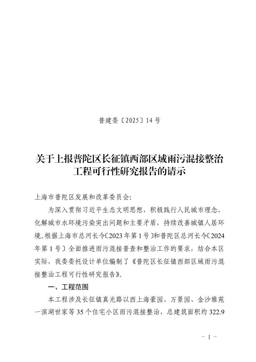 为深入贯彻习近平生态文明思想,积极践行人民城市理念,化解城市水环境污染突出问题和主要矛盾,持续改善城镇人居环境。根据上海市总河长令〔2023年第1号〕和普陀区总河长令〔2024年第1号〕全面推进雨污混接普查和整治工作的要求,结合本区实际,我委委托设计单位编制了《普陀区长征镇西部区域雨污混接整治工程可行性研究报告》。