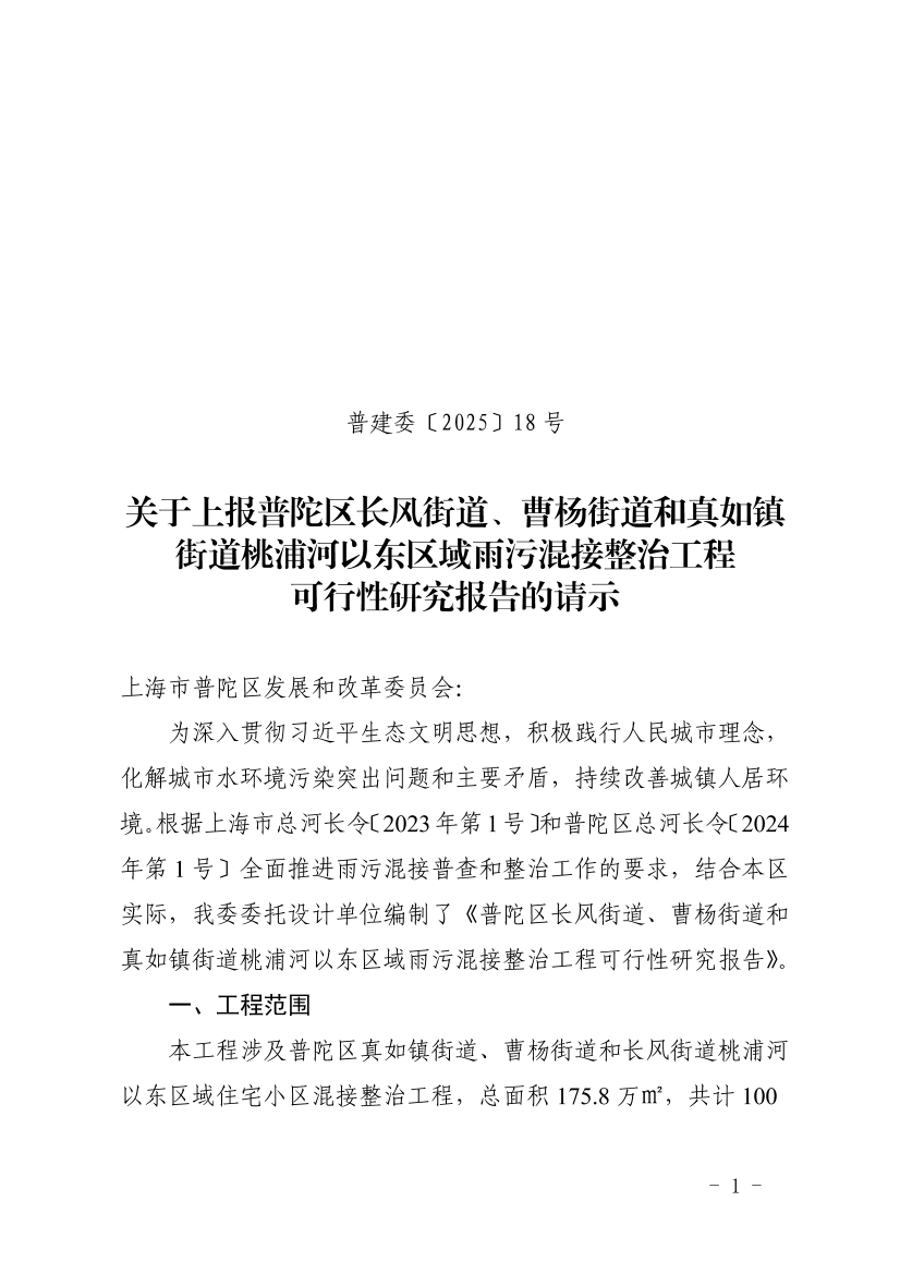 为深入贯彻习近平生态文明思想,积极践行人民城市理念,化解城市水环境污染突出问题和主要矛盾,持续改善城镇人居环境。根据上海市总河长令〔2023年第1号〕和普陀区总河长令〔2024年第1号〕全面推进雨污混接普查和整治工作的要求,结合本区实际,我委委托设计单位编制了《普陀区长风街道、曹杨街道和真如镇街道桃浦河以东区域雨污混接整治工程可行性研究报告》。